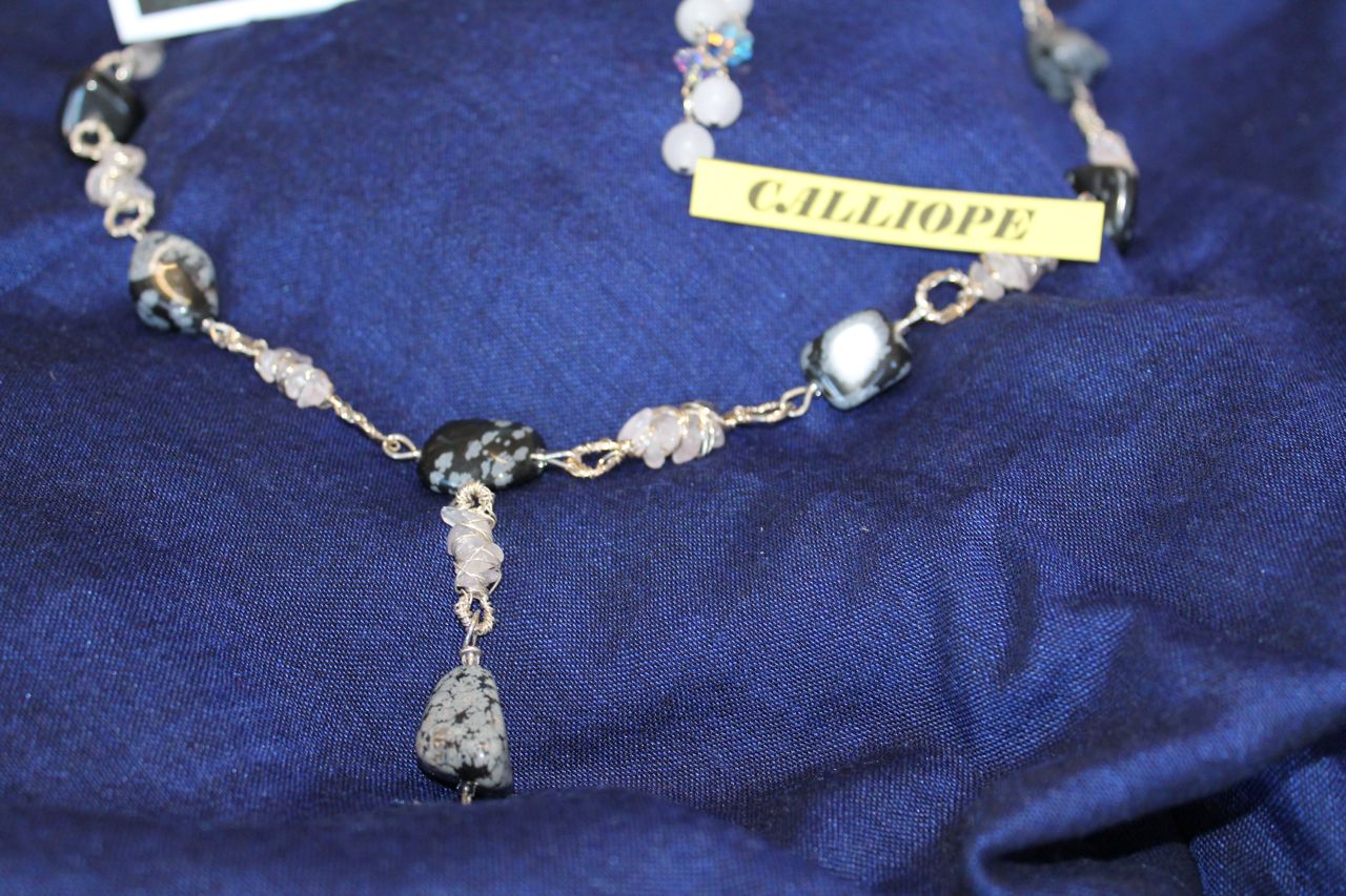 La collana Calliope è costituita da pezzi di ossidiana fiocco di neve(dal classico colore nero con macchie che vanno dal grigio al bianco, dalla forma di un fiocco di neve, da qui il nome)incastonati nel filo in argento, intercalati con piccoli pezzi di quarzo rosa, anch’essi incastonati. la parte centrale è formata da un pendente della stessa forma degli elementi che compongono la collana.
